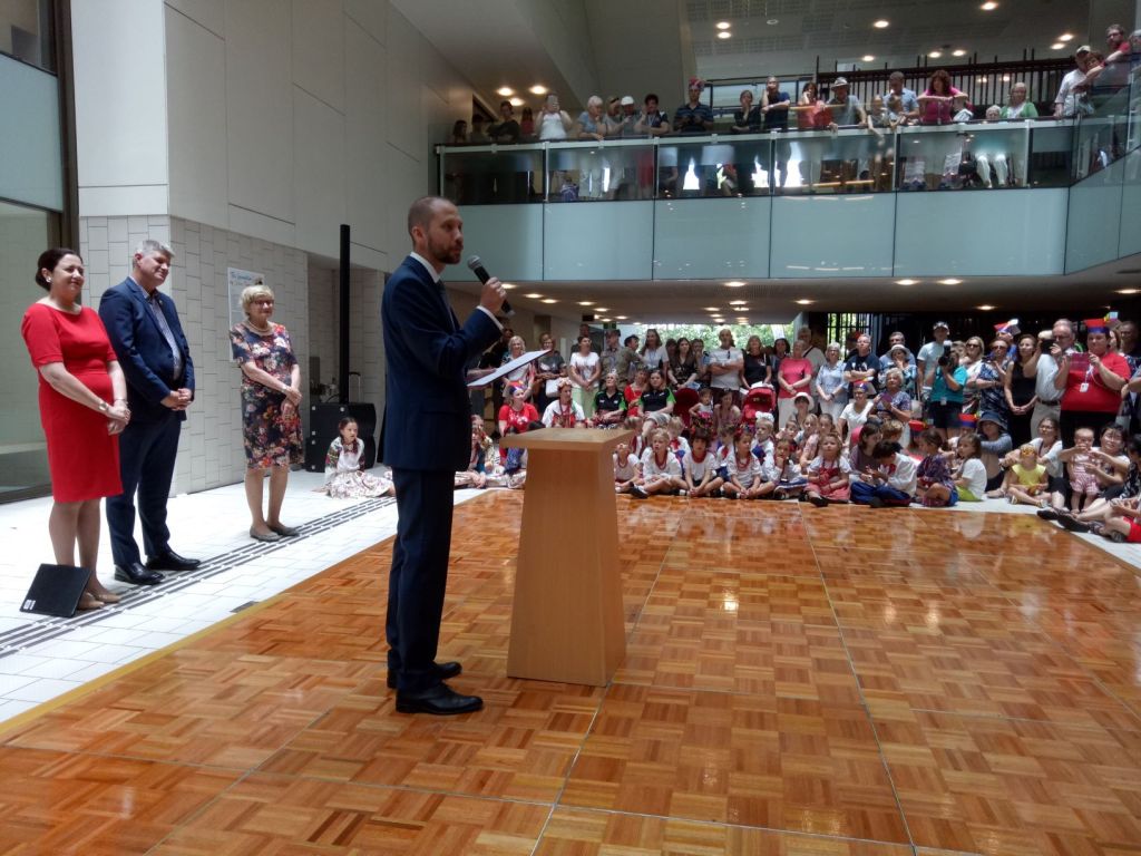 Zdj.1 - otwarcie Festiwalu, przemawia Ambasador RP w Canberze M. Kolodziejski; stoją od lewej Premier stanu QLD A. Palaszczuk, Minister ds. samorządu terytorialnego, wyścigów i wielokulturowości S. J. Hinchliffe i Prezes RNPA M. Kwiatkowska.