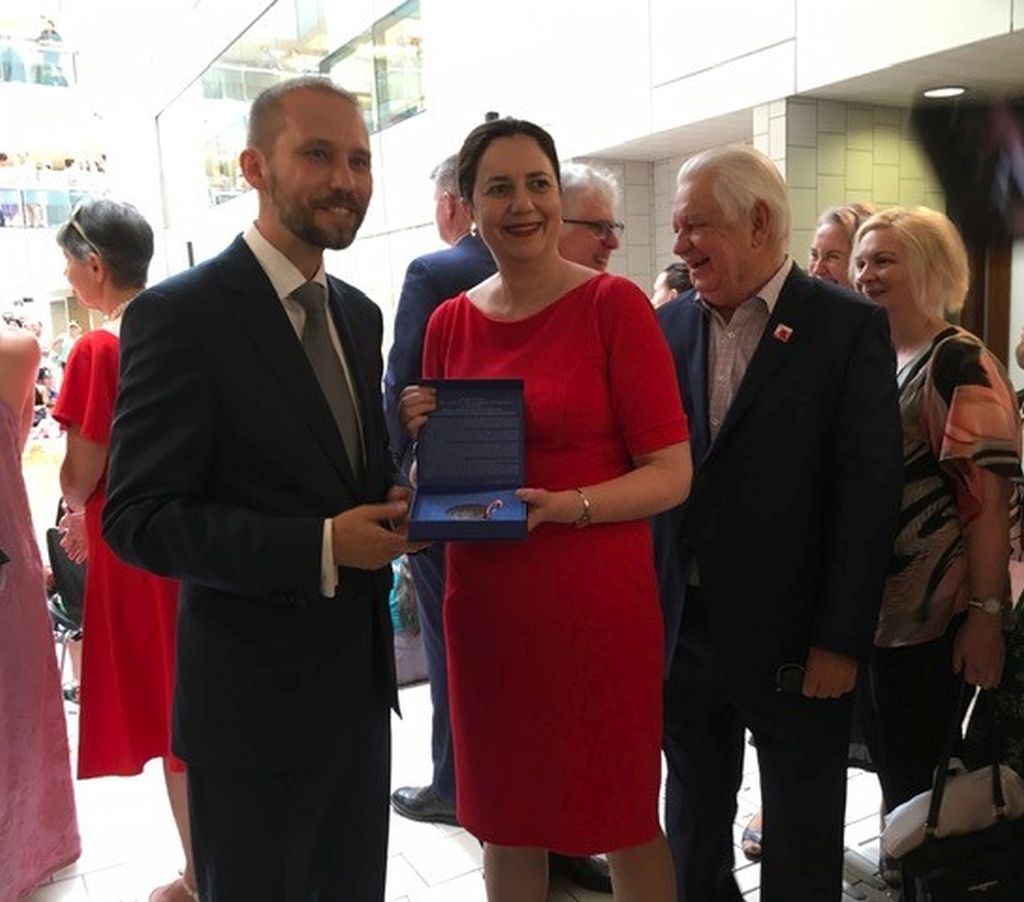 Zdj.3 - ambasador M. Kołodziejski wręcza premier A. Palaszczuk medal 100-lecia odzyskania przez Polskę niepodległości, z prawej strony Henry Palaszczuk, znany polityk, obecnie na emeryturze, autor MK