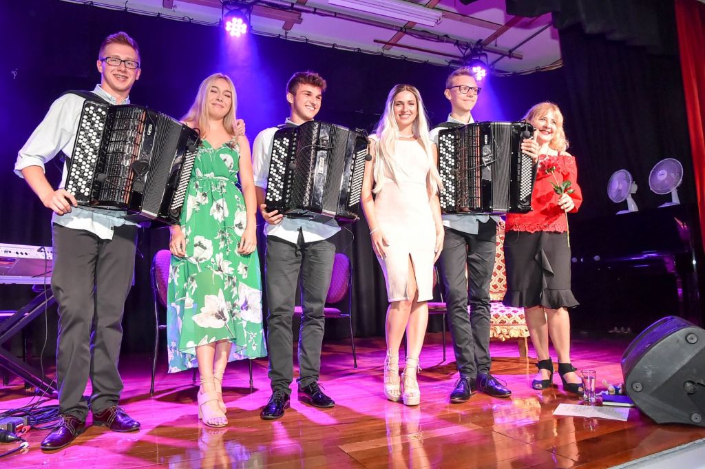 Zdj.14 - trzej młodzi akordeoniści z Polski w towarzystwie artystek z Australii; od lewej P. Motyka, M. Stempień, P. Poterała, I. Cehajic, M. Skopek i T. Tabor, autor R. Federowicz